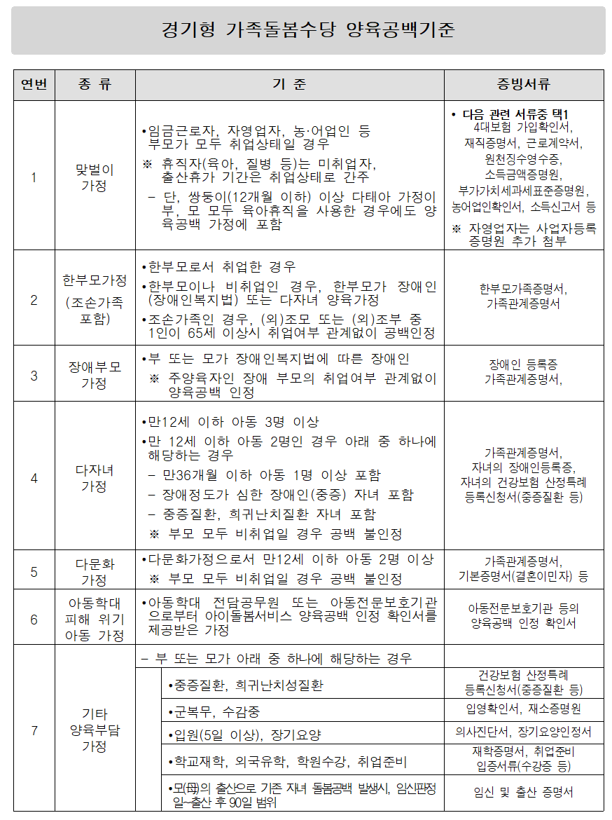 양육공백 기준은 각 가정의 형태에 따라 상이하여 증빙서류와 기준을 반드시 확인을 하셔야 합니다.